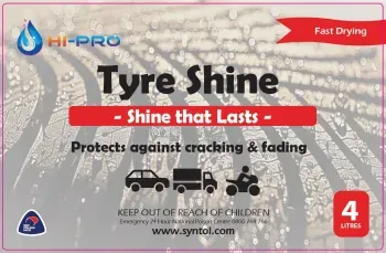 Hi-Pro Tyre Shine is applicable for all tyres, giving a shiny black finish. Apply by brush or air spray.