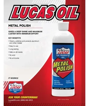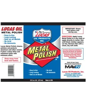 Lucas Metal Polish cleans, polishes and protects aluminum and other metals including chrome, magnesium, stainless steel, silver, brass and gold. It gives a deep shine maximum luster with little effort. Our fast acting metal polish is simple to use and safe on metals. It contains no acid or ammonia.