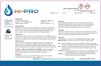 Hi-Pro Deck ‘n’ Fence is an acidic cleaner. Avoid contact with eyes. Wash eyes with water for 10 to 15 minutes if exposed. It is recommended, as with all oils and cleaners, that repeated or prolonged contact with Deck ‘n’ Fence in neat or diluted form is kept to a minimum. At no time should neat (undiluted) product be disposed of into sewers. Avoid disposal of Deck ‘n’ Fence in neat or diluted form, into storm water or other waterways at all times. If spillage occurs, contact