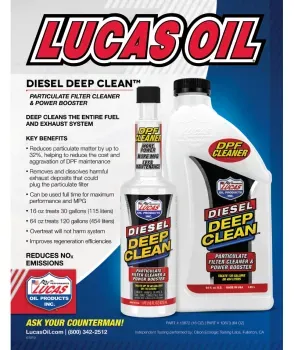 Lucas Diesel Deep Clean is a new Lucas technology developed to reduce the cost and hassle of particulate filter maintenance. It is an excellent preventative maintenance product. It causes the fuel to burn much cleaner, thus eliminating a lot of particulate matter that would otherwise go into the exhaust system causing “regens.” It also cleans out much of the matter already trapped in the filter. This eliminates exhaust backpressure allowing the engine to run easier and cooler as well as lowering the aggravation and down time associated with particulate filters.