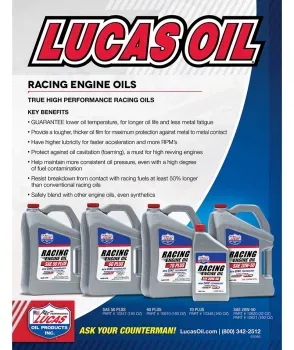 The "PLUS" is for the extra additives above and beyond the normal additive package found in ordinary racing oils. This true high performance lubricant was especially developed to protect top fuel engines. This was tested extensively on the 1996 NHRA circuit and every crew who used it claimed it to the "BEST". PLUS resists fuel dilution like no other oil possibly can. It allows you to maintain oil pressure from one end of the track to the other. If you're into "NITRO" you definitely need to be into LUCAS PLUS Racing Oils.