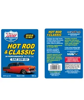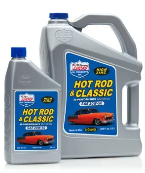 Lucas Hot Rod & Classic Car Motor Oil SAE 20W-50 is for muscle, showroom, classic and trophy cars without catalytic converters. It can be used in racing applications. Not recommended for passenger car use.